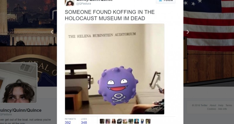 Przeciwko Pokemon GO wystąpiło także waszyngtońskie Muzeum Holokaustu. Miejsce to masowo odwiedzają użytkownicy aplikacji, którzy poszukują w nim stworka znanego jako Koffing. Warto dodać, że pokemon emitujący trujące gazy, miał znajdować się obok znaku kierującego do Audytorium Heleny Rubinstein, gdzie przedstawione są wspomnienia osób, którym udało się uniknąć śmierci w niemieckich komorach gazowych w trakcie II wojny światowej. Dlatego Muzeum zaapelowało do graczy, aby zachowali powagę, bo teren placówki nie jest najlepszym miejscem do wirtualnych polowań: Zabawa w taką grę nie jest odpowiednia w przypadku muzeum, które upamiętnia ofiary nazizmu. Chcemy wykluczyć muzeum z udziału w tej grze – powiedział Andrew Hollinger, pracownik placówki.
