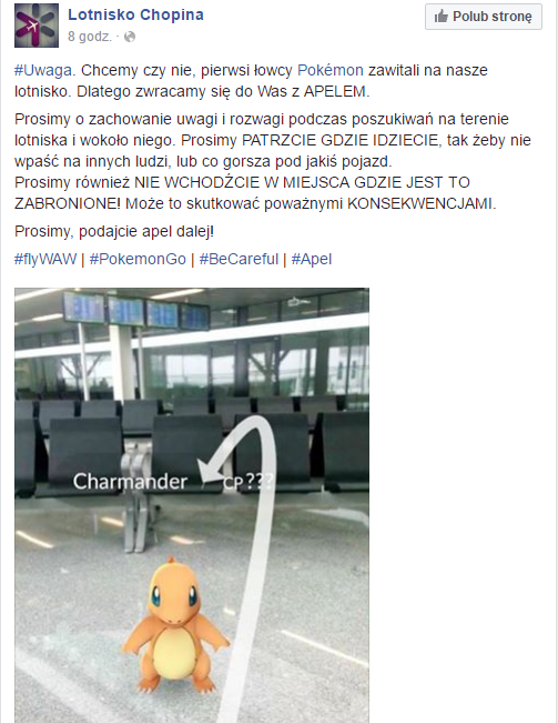 Tuż po premierze Pokemon GO w Polsce Lotnisko Chopina, za pośrednictwem Twittera, wystosowało apel do graczy: