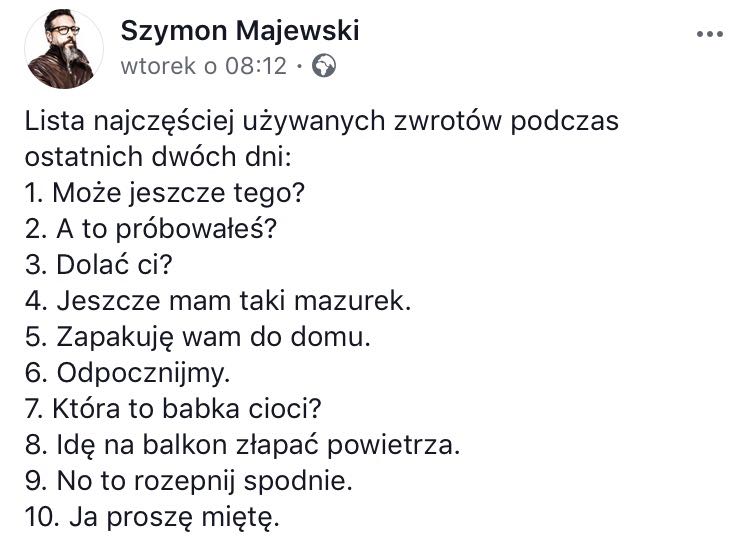 Ale wracając, zdecydowanie wszystkie hasła były, czyli walka z przejedzeniem, tak zwane Mazurkas Travel, czyli wymiana mazurków, tak jak wymienia się proporce. Okazuje się, że kupiło się cztery rodzaje, a je się i tak te robione. A po świętach pojawia się typowy problem z suchymi ciastami, które będę jadł do kawy przez następny tydzień, żeby nic się nie zmarnowało — tę obsesję mam po dziadku.